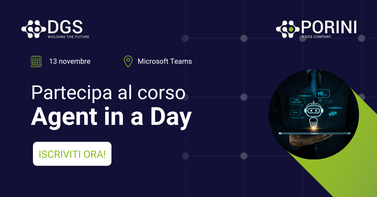 La giornata di formazione è condotta dai docenti esperti di PORINI – CDC Microsoft del gruppo DGS, azienda specializzata nello sviluppo di soluzioni con Microsoft Copilot Studio, Le nostre competenze sono certificate dalla Microsoft Copilot Specialization.